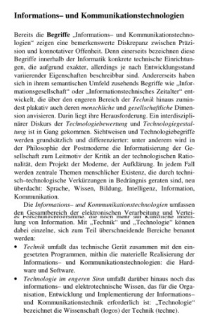 Bereits die Begriffe „Informations– und Kommunikationstechnologien“ zeigen eine bemerkenswerte Diskrepanz zwischen Präzision und konnotativer Offenheit. Denn einerseits bezeichnen diese Begriffe innerhalb der Informatik konkrete technische Einrichtungen, die aufgrund exakter, allerdings je nach Entwicklungsstand variierender Eigenschaften beschreibbar sind. Andererseits haben sich in ihrem semantischen Umfeld zusehends Begriffe wie „Informationsgesellschaft“ oder „Informationstechnisches Zeitalter“ entwickelt, die über den engeren Bereich der Technik hinaus zumindest plakativ auch deren menschliche und gesellschaftliche Dimension anvisieren. Darin liegt ihre Herausforderung. Ein interdisziplinärer Diskurs der Technologiebewertung und Technologiegestaltung ist in Gang gekommen. Sichtweisen und Technologiebegriffe werden grundsätzlich und differenzierter: unter anderem wird in der Philosophie der Postmoderne die Informatisierung der Gesellschaft zum Leitmotiv der Kritik an der technologischen Rationalität, dem Projekt der Moderne, der Aufklärung. In jedem Fall werden zentrale Themen menschlicher Existenz, die durch technisch–technologische Verkürzungen in Bedrängnis geraten sind, neu überdacht: Sprache, Wissen, Bildung, Intelligenz, Information, Kommunikation.